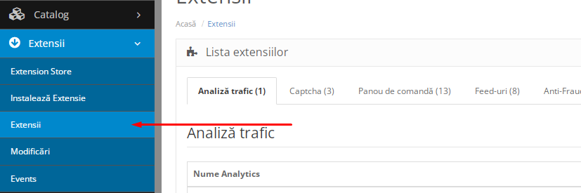 1. Pentru a configura modulul Aweb GA4, accesati in meniul principal Extensii -> Extensii
