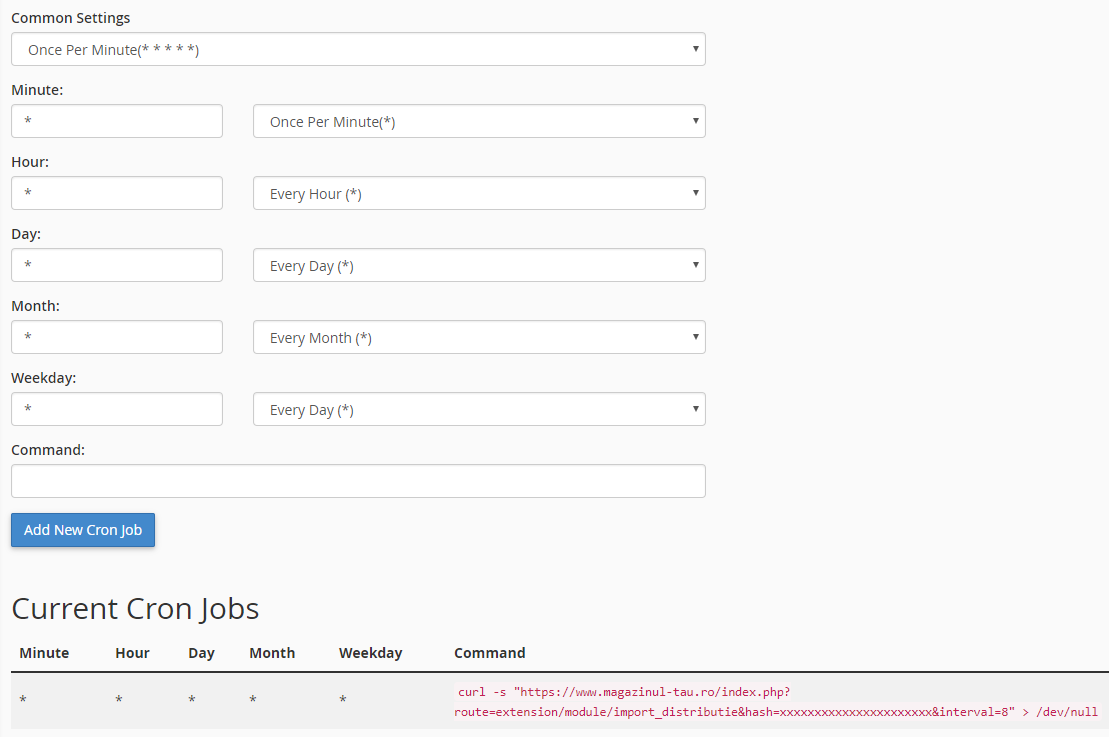 Mergeți la secțiunea "Add New Cron Job. Puteți alege între meniul "Common Settings", sau să completați propriile valori. Completați formularul în modul următor: