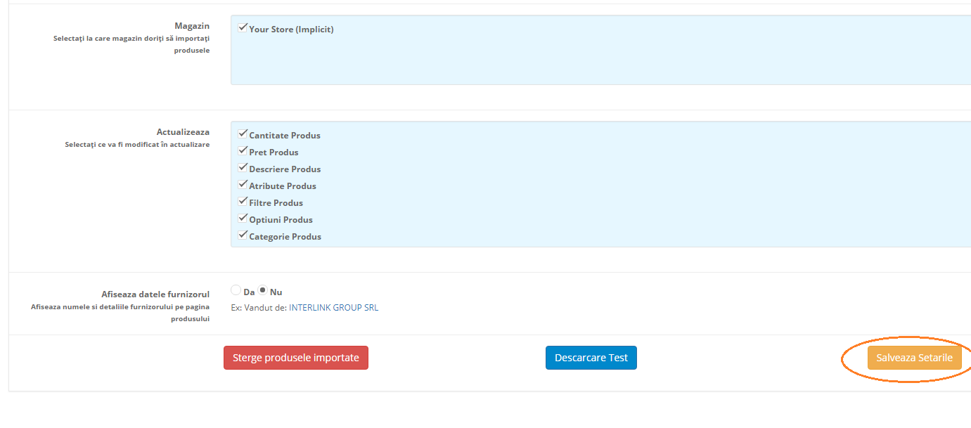 - Limba globală – în cazul unui site multi-language, produsele importate vor fi disponibile doar pentru limba selectata aici (Atenție! Furnizorul oferă produse cu descriere exclusiv în limba română);