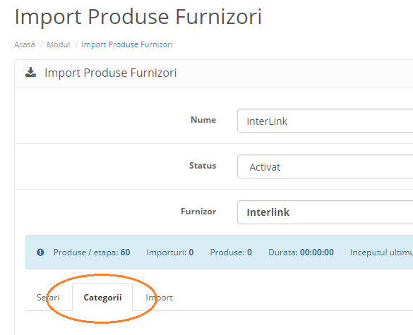 Este recomandat ca importul de produse de la furnizor să se efectueaze la un interval de 8 ore. Acesta se poate realiza manual, sau în mod automat, cu ajutorului unui "Cron Job". Primul pas în acest sens la configurarea platformei dvs. ar fi configurarea acestui modul de import. Pentru a realiza acest lucru, urmați pașii de mai jos: