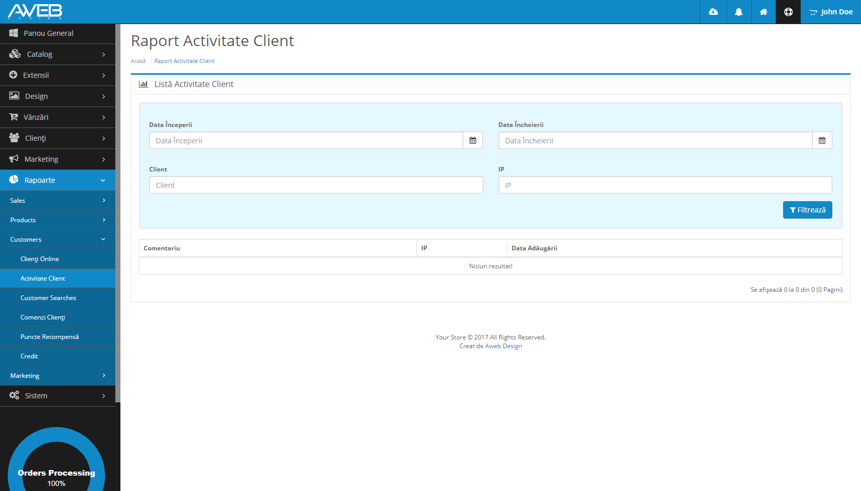 Această secțiune vă va genera un raport despre comenzile plasate de clienți. Raportul conține următoarele date: