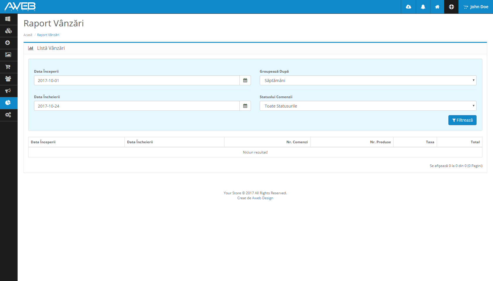 Raportul privind comenzile primite poate fi accesat din Rapoarte -> Vânzări -> Vânzări. Informațiile privind comanda pot fi zilnice, săptămânale, lunare, fie anuale, în funcție de opțiunea pe care o selectați în caseta "Grupare Dupa". Raportul de Comenzi afișează următoarele informații: