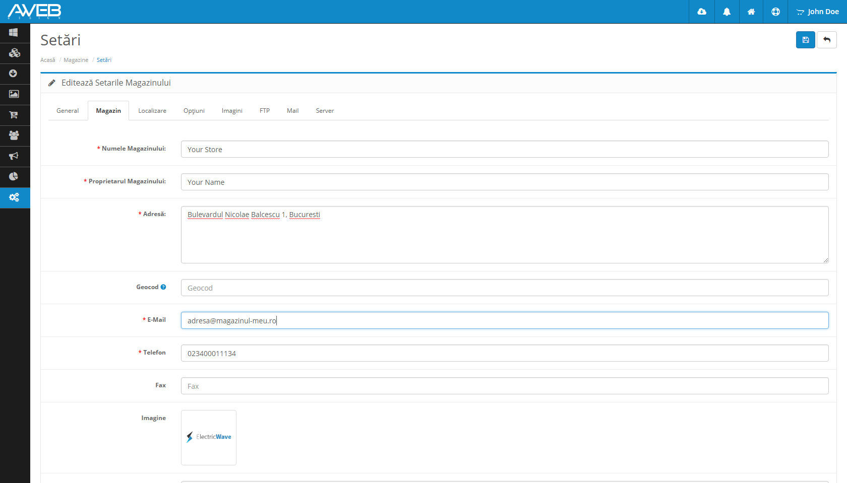 Pentru a modifica setările magazinului precum nume magazin, date de contact, adresa, program, etc., accesați Sistem -> Setări -> Editare și tab-ul Magazin: