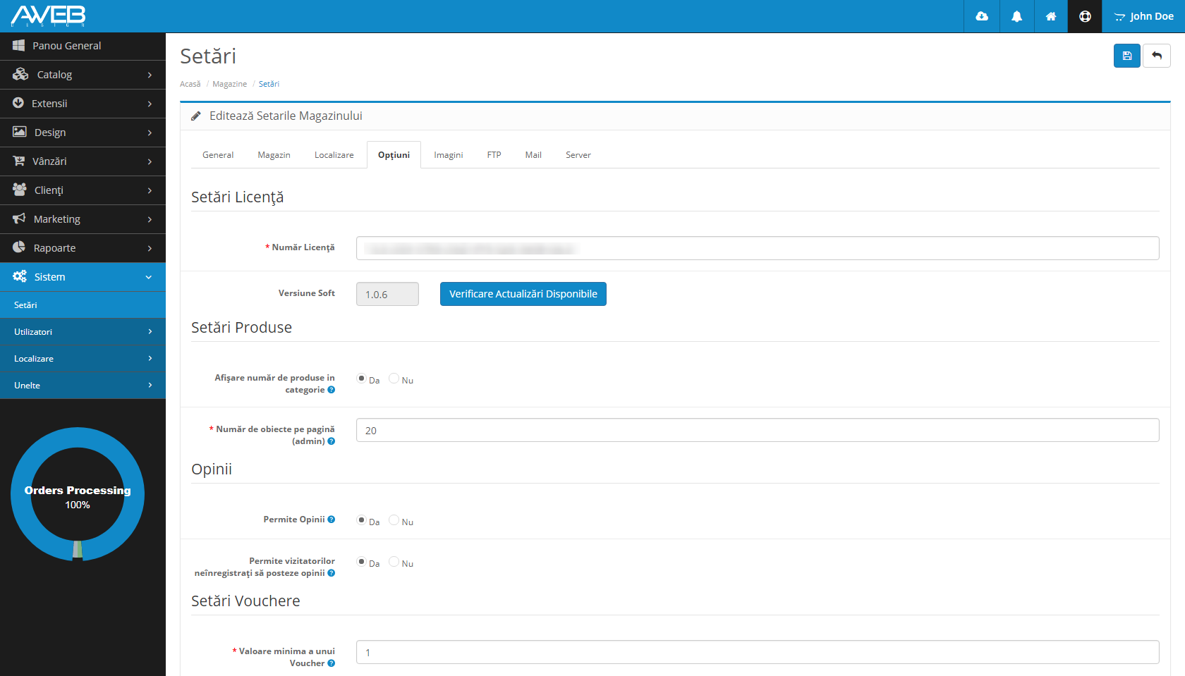 În tab-ul Opțiuni puteți modifica o mulțime de setări, printre care setările opiniilor lăsate de utilizatori, afișării produselor, setările stocului, etc.