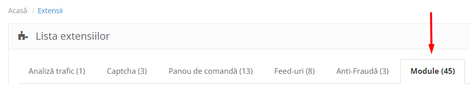 2. Pe pagina extensiilor, selectati tab-ul Module.