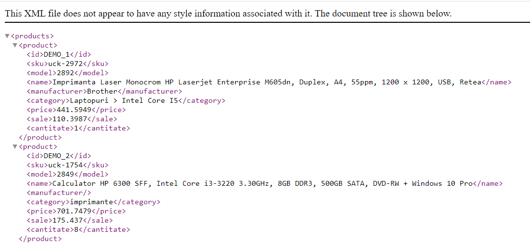 Dupa ce ati apasat butonul "Salveaza" din coltul din dreapta sus al ecranului, copiati link-ul URL (CTRL+C) din dreptul sectiuni "Accesare Feed" , deschideti Browserul si si apasati Ctrl+V urmat de tasta Enter . Veti observa ca se va deschide un fisier ca in exemplul de mai jos: