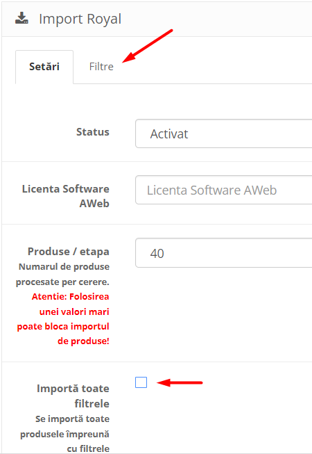 Produse / etapa -Numarul de produse procesate per cerere. Atentie: Folosirea unei valori mari poate bloca importul de produse!