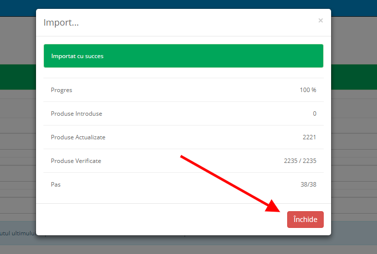 Se selecteaza butonul Inchide dupa ce importul produselor a fost finalizat: