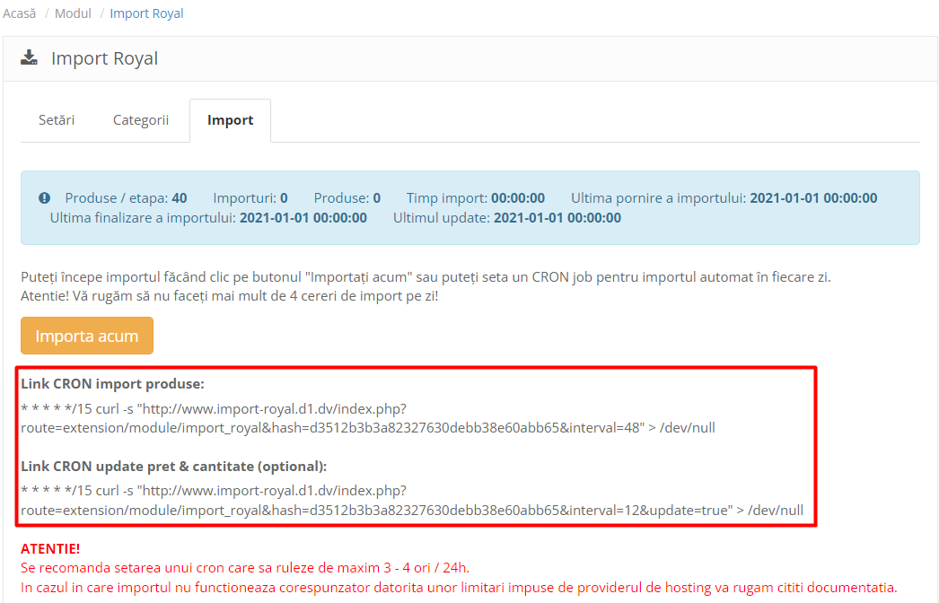 Este recomandat ca importul de produse de la furnizor să se efectueaze la un interval de 8 ore. Acesta se poate realiza manual, sau în mod automat, cu ajutorului unui "Cron Job". Primul pas în acest sens la configurarea platformei dvs. ar fi configurarea acestui modul de import. Pentru a realiza acest lucru, urmați pașii de mai jos: