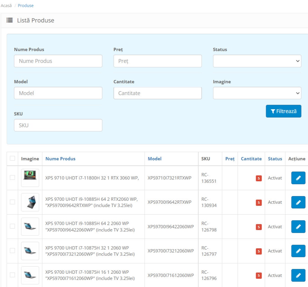 Produsele importate vor fi disponibile în secțiunea Admin -> Catalog -> Produse.