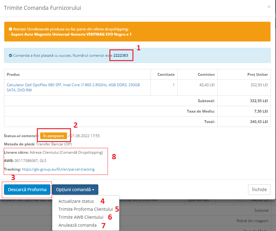 4.5. Trimite Proforma Clientului (aceasta optiune va fi disponibila doar in cazul in care metoda de plata aleasa este 'Ordin de Plata', iar livrarea se va face direct catre client – tip Dropshipping) – daca apasam pe aceasta optiune, proforma va fi trimisa prin e-mail clientului final.