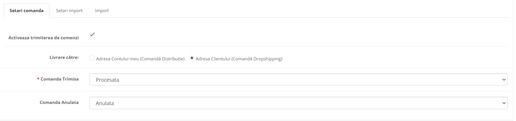 Dupa ce ati editat modulul Lerato Dropshipping selectati tab-ul Setari Comanda care cuprinde urmatoarele optiuni: