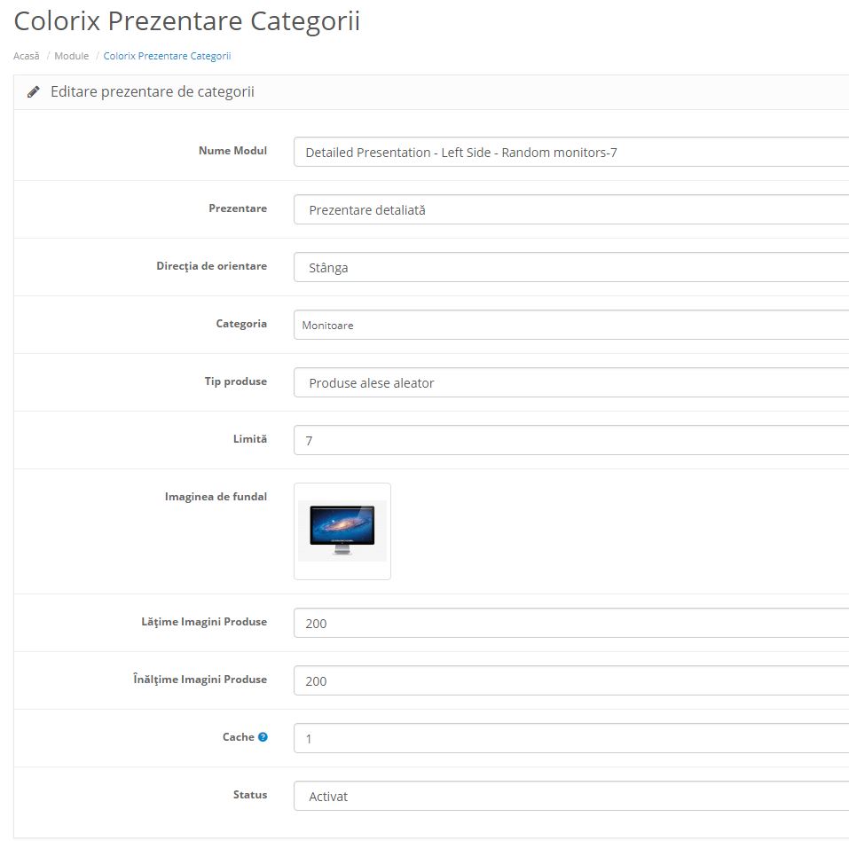 Pentru configurarea acestui modul, accesați Extensii -> Extensii -> Module -> Instalați Colorix Prezentare Produse Categorie, apoi îl editați, având următoarele opțiuni: