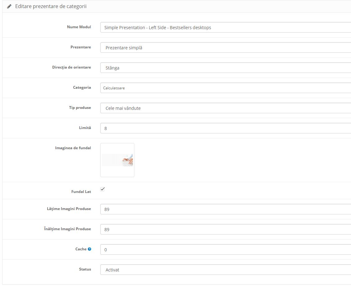 - Tipul produselor(cele mai vândute din categorie, ultimele adăugate în categorie, produse cu preț special din categorie, produse populare din categorie, produse alese aleator din categorie, sau alegere individuală a produselor);