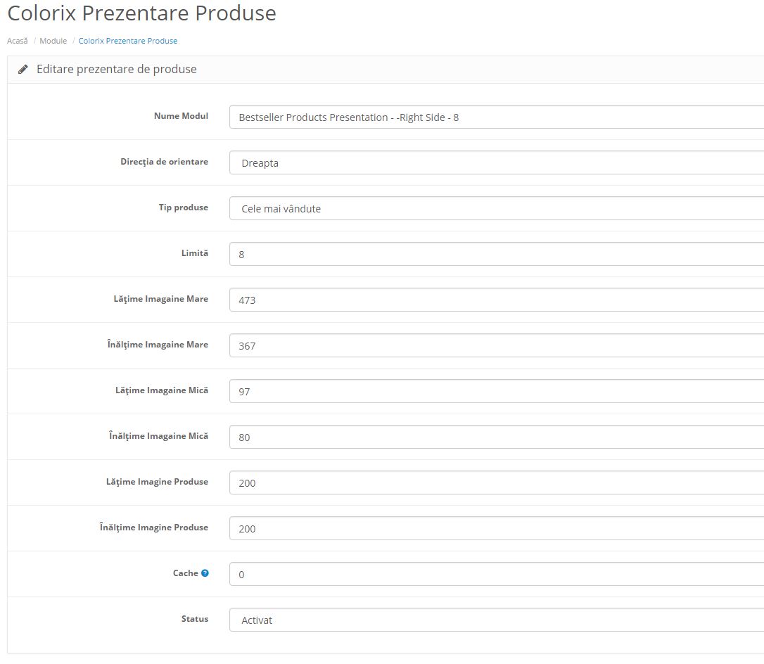 Pentru configurarea acestui modul, accesați Extensii -> Extensii -> Module -> Instalați Colorix Prezentare Produse, apoi îl editați, având următoarele opțiuni: