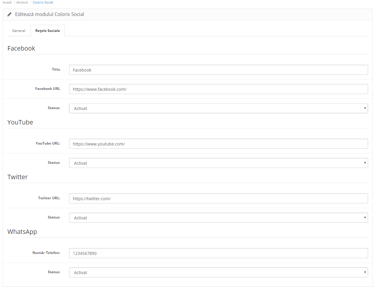 Accesați Extensii -> Extensii -> Module -> Instalați Colorix Social, după care îl editați și declarați status-ul Activat.