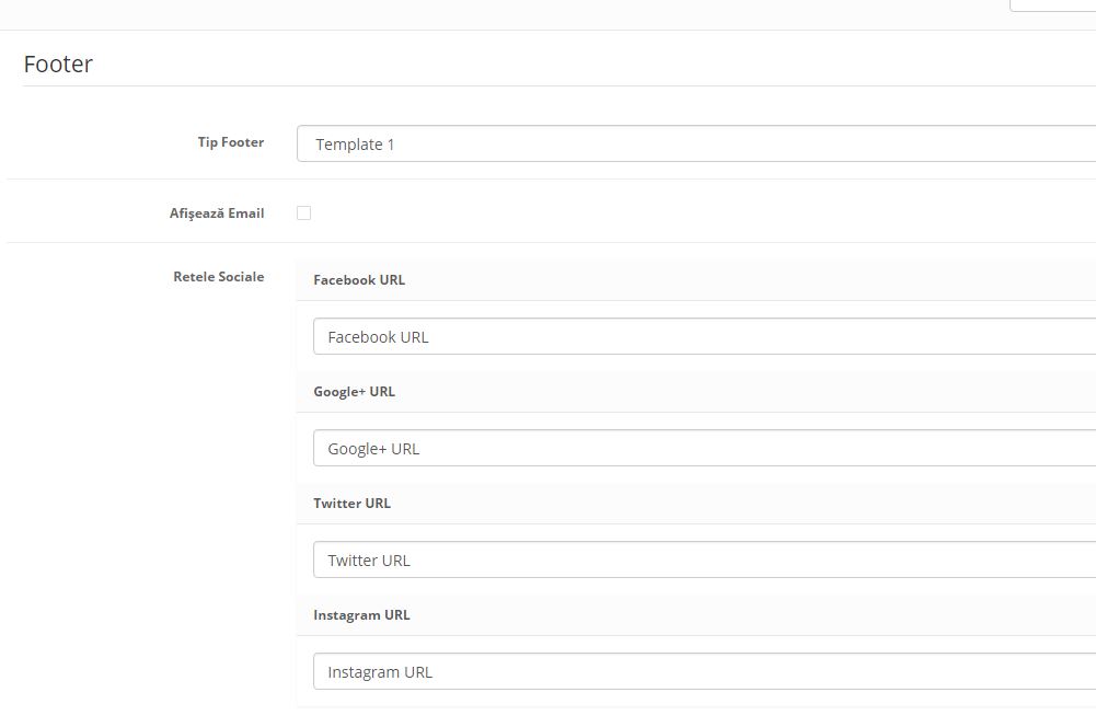 Puteți adăuga 3 tipuri diferite de secțiuni: rețele sociale(Facebook, Google+, Instagram, sau Twitter), text footer(ex: secțiune "despre noi"), și Custom HTML .