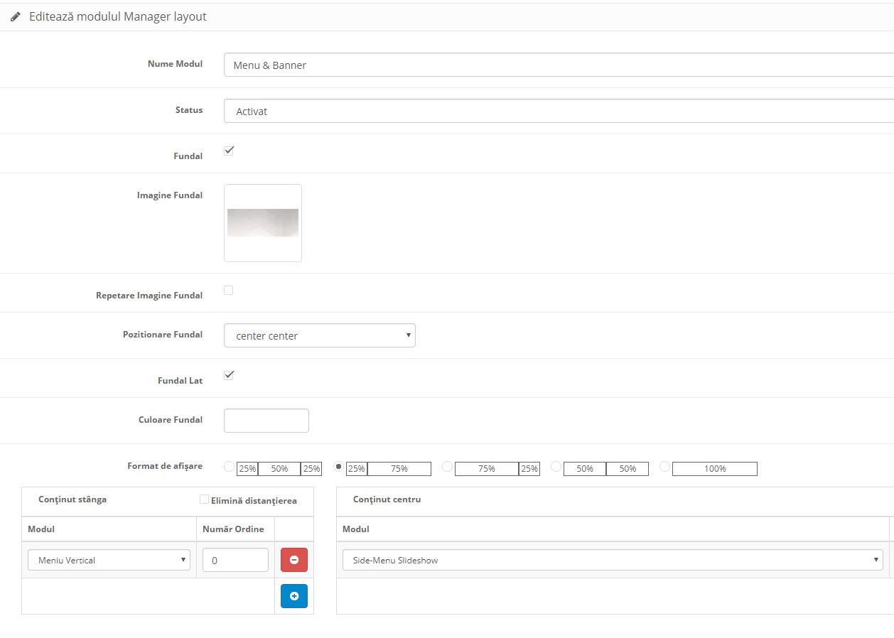 Meniul din bara de navigare poate fi afișat pe vertical alături de alte extensii. Ca exemplu vom adăuga un banner folosind extensiile Meniu Vertical, Slideshow și Manager Layout