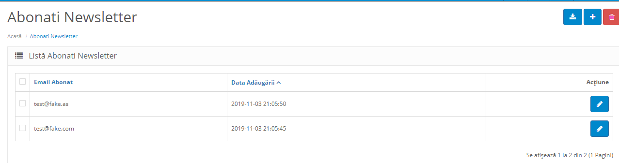 După instalarea acestui modul, accesați tab-ul newsletter subscribers(din meniul Marketing). Aici puteți vedea toți abonații newsleter-ului, adăuga sau șterge abonați, sau să exportați lista acestora.