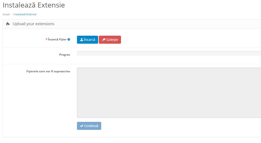 După verificarea acestor setări, în meniul Extensii -> Instalează Extensie, încărcați arhiva "colorix.ocmod.zip". După încărcare apăsați butonul Continuă.